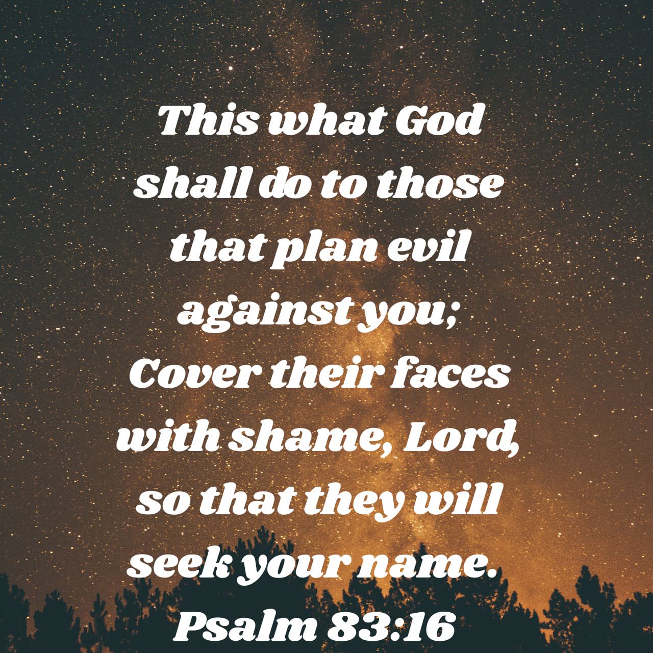 14 삼림을 사르는 불과 산에 붙는 불길 같이 15 주의 광풍으로 그들을 쫓으시며 주의 폭풍으로 그들을 두렵게 하소서. 16 여호와여 그들의 얼굴에 수치가 가득하게 하사 그들이 주의 이름을 찾게 하소서. 17 그들로 수치를 당하여 영원히 놀라게 하시며 낭패와 멸망을 당하게 하사 18 여호와라 이름하신 주만 온 세계의 지존자로 알게 하소서