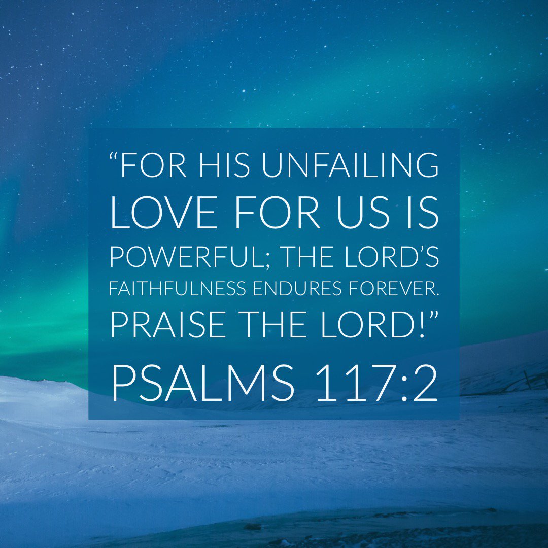 1 너희 모든 나라들아, 여호와를 찬양하며 너희 모든 백성들아, 그를 찬송할지어다. 2 우리에게 향하신 여호와의 인자하심이 크시고 여호와의 진실하심이 영원함이로다. 할렐루야.