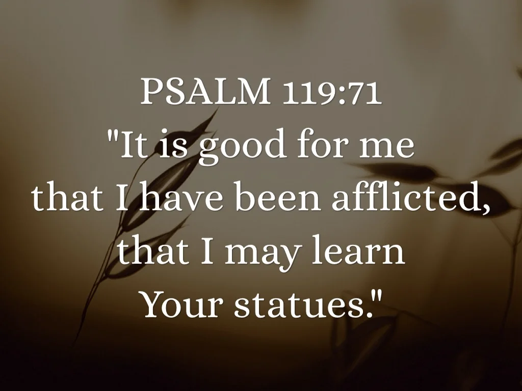 고난은 아픔을 겪지 않았더라면 결코 공부하지 않았을 자신의 본모습과 하나님, 그리고 삶에 관해 배우는 학교입니다(66-67절). 주님이 가르쳐 주신 이루 말할 수 없이 값진 가르침들을 돌아보면서, 어려움을 당하는 이들은 역경을 주신 분께 고백할 수 있게 됩니다. "주님은 선하십니다. 주님이 하신 일도 선합니다"(68절, 65절과 71절을 참고하십시오.) 이 학교에 다니며 하나님 말씀에 깊이 젖어 들면 마음의 감도가 아주 예민해지며(70절) 성경 자체에 묻힌 생각지도 못한 보물들을 볼 수 있는 눈이 열립니다(72절). 하나님 말씀만 품으면 고난을 더 깊이, 더 슬기롭게, 더 풍성하게, 더 사랑스럽게, 심지어 더 행복하게 헤쳐 나갈 수 있다니, 얼마나 놀라운 일입니까!